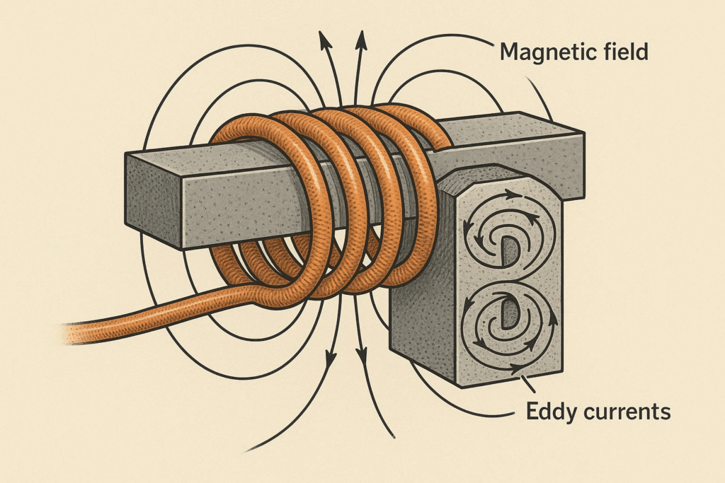 For magnetic materials like steel, an additional heating mechanism called hysteresis loss occurs when the alternating magnetic field repeatedly magnetizes and demagnetizes the material’s molecular structure, creating friction and additional heat generation.
